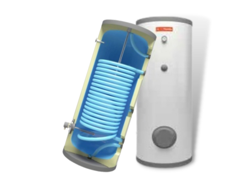 Carbon steel tanks, vitrified treatment with titanium enamel, for the production of drinking water, coil with large exchange surfaces, intended for aerothermal, biomass or other production plants that require large exchange surfaces.