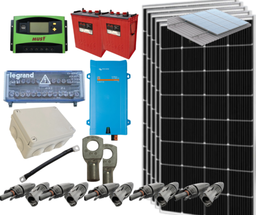 The Isolated Solar Kit 1600W 12V 5000Whdia, a small system that powers household appliances and lights in houses with sporadic use.